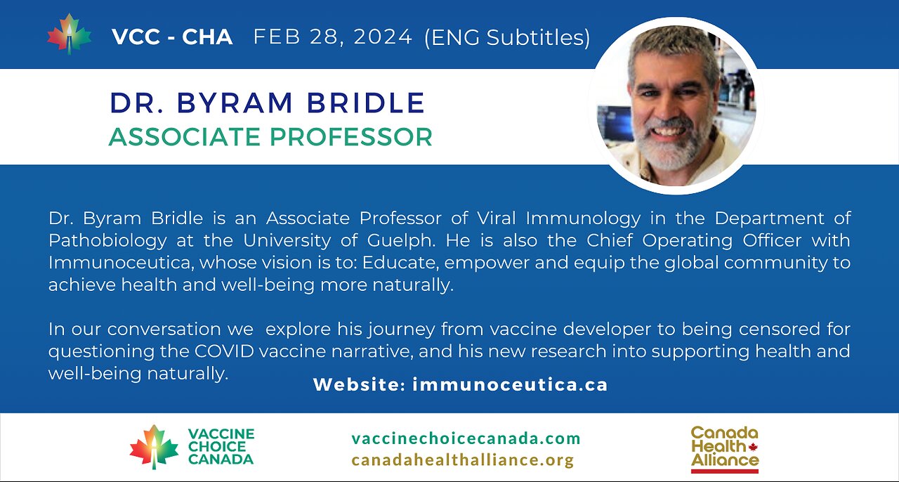 Dr. Byram Bridle is an Associate Professor of Viral Immunology in the Department of Pathobiology at the University of Guelph. He is also the Chief Operating Officer with Immunoceutica, whose vision is to: Educate, empower and equip the global community to achieve health and well-being more naturally.