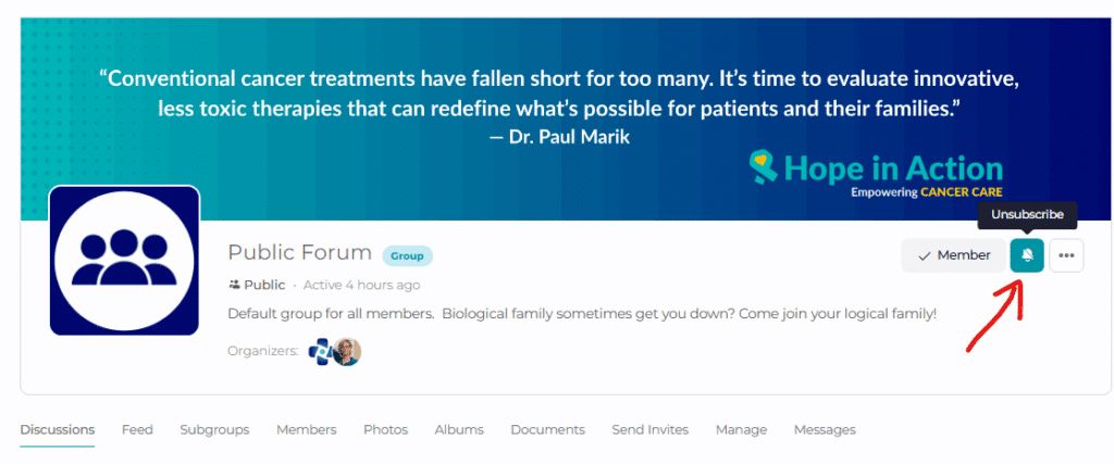 Clicking the unsubscribe bell unsubscribes you only from notifications for that item—such as a specific group, forum, or discussion—but does not remove you from the discussion or group itself. You will stop receiving notifications for new posts or activity related to that item, but you will still have access and remain a member or participant unless you explicitly leave the group or unsubscribe in another way
