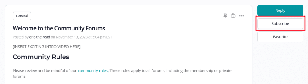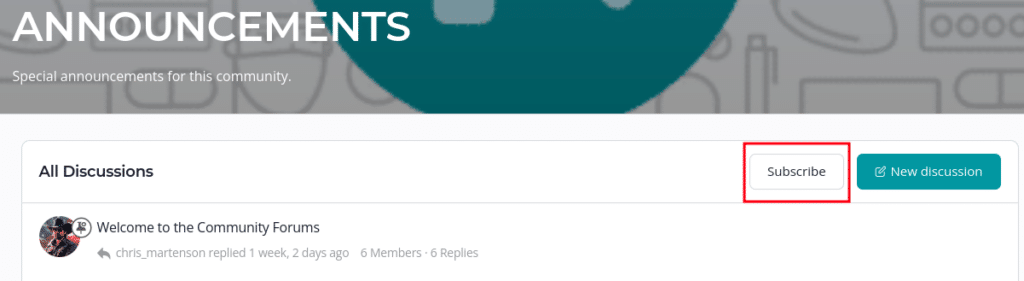 You can subscribe to an entire Forum and be alerted of any new Discussion started there. We recommend you do this for the Announcements forum, so you don’t miss important updates.