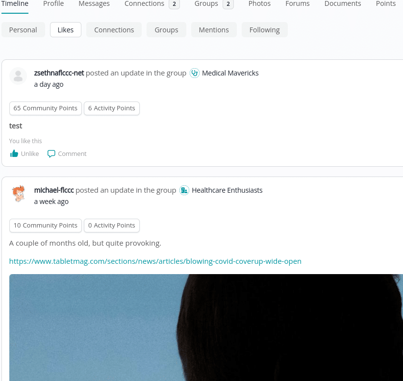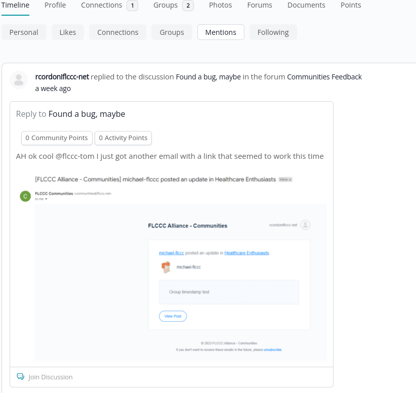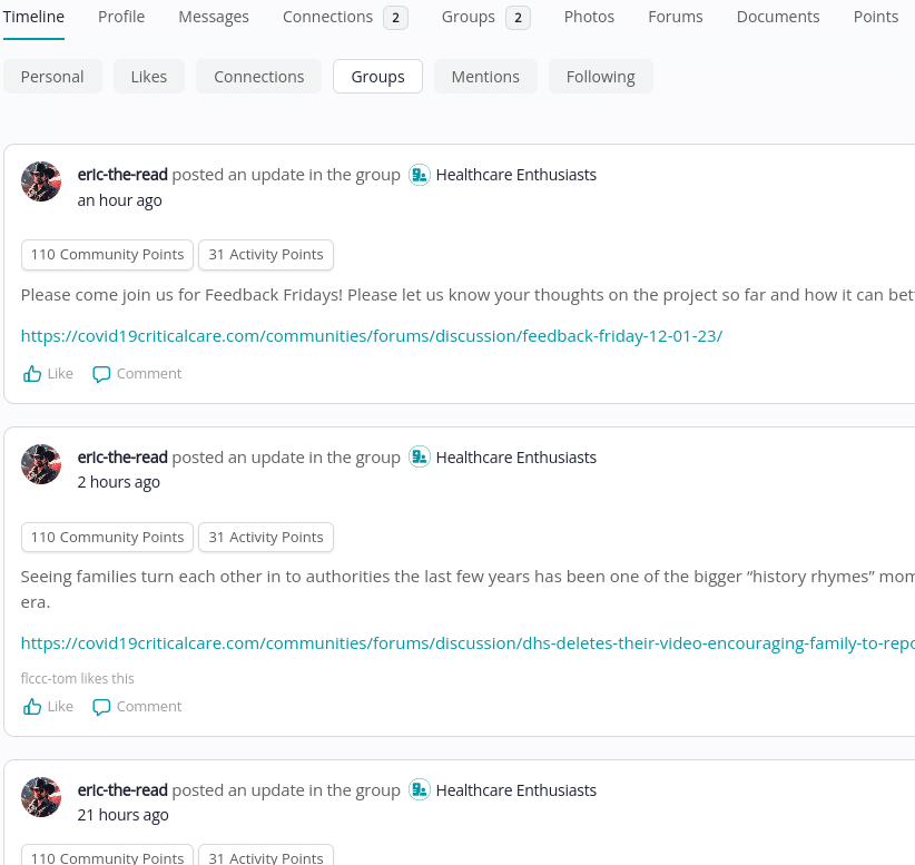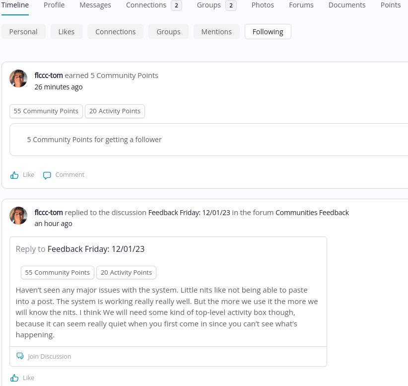 Your Timeline is a great way to see various activities you may be interested in, such as your groups, connections/follows, and mentions.