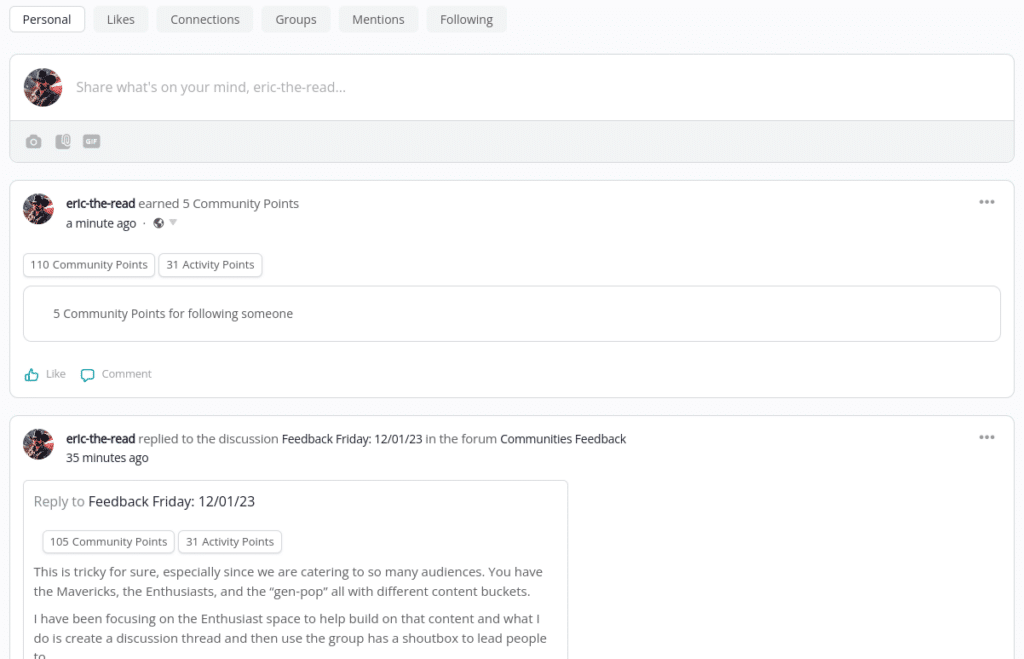 The Personal tab of a user’s Timeline shows their activity across the community. You will see entries for creating new Discussions in the forum, new posts in their Groups, replies to Discussions or Group posts, etc.