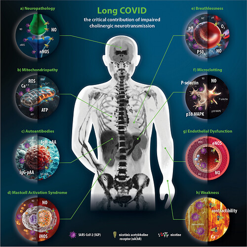 “The described correlations explain the high incidence of IgG-type pAA associated with COVID-19 due to SARS-CoV-2 induced T-cell stimulation leading to a shift from nAA-IgM to pAA-IgG. Blockade of membrane-bound nAChRs of B cells by SGP may perpetuate this effect through release of proinflammatory cytokines with further nAA-IgM/pAA-IgG shift. The persistent disruption of nAChR-driven inhibition of inappropriate B cell proliferation and antibody overproduction would be a plausible cause of auto-aggressive immune dysregulation with subsequent ADs in LC.”