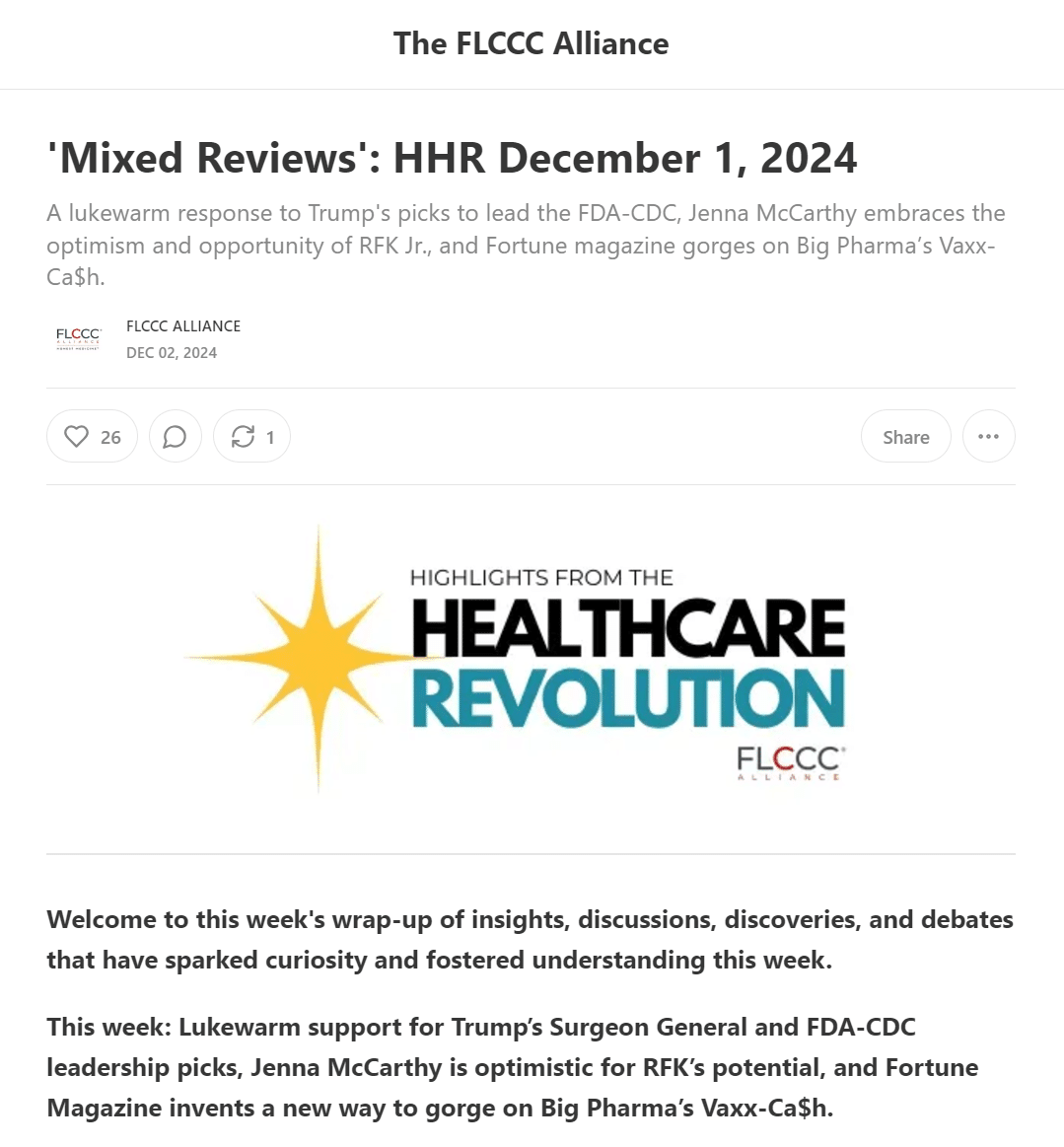 A lukewarm response to Trump’s picks to lead the FDA-CDC, Jenna McCarthy embraces the optimism and opportunity of RFK Jr., and Fortune magazine gorges on Big Pharma’s Vaxx-Ca$h.