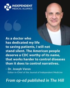 Dr. Joseph Varon is president and Chief Medical Officer of the Independent Medical Alliance. He spent 715 consecutive days in full protective gear, fighting COVID-19 cases as the Chief Medical Officer in charge of the ICU at Houston’s United Memorial Medical Center.