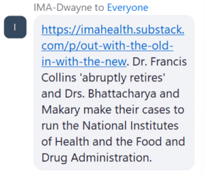 https://imahealth.substack.com/p/out-with-the-old-in-with-the-new . Dr. Francis Collins ‘abruptly retires’ and Drs. Bhattacharya and Makary make their cases to run the National Institutes of Health and the Food and Drug Administration.