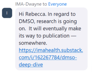 From IMA-Dwayne : Hi Rebecca. In regard to DMSO, research is going on. It will eventually make its way to publication — somewhere. An Immediate Pause: HHR April 27, 2025